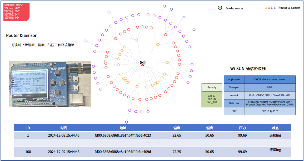 如下图所示,为持续提升Wi-SUN产品性能,350VIP浦京微在实地部署了一个具有一定规模的Wi-SUN(FAN)网络,以实现对其通信性能的有效把控。现阶段,该网络已充分验证了上百个Router Node的互联互通,可对Leaf Node的温度、湿度与气压数据进行实时采集,并通过Border Router网关协议将这些环境数据实时上传至后台无线组网数据平台或云端控制系统中。