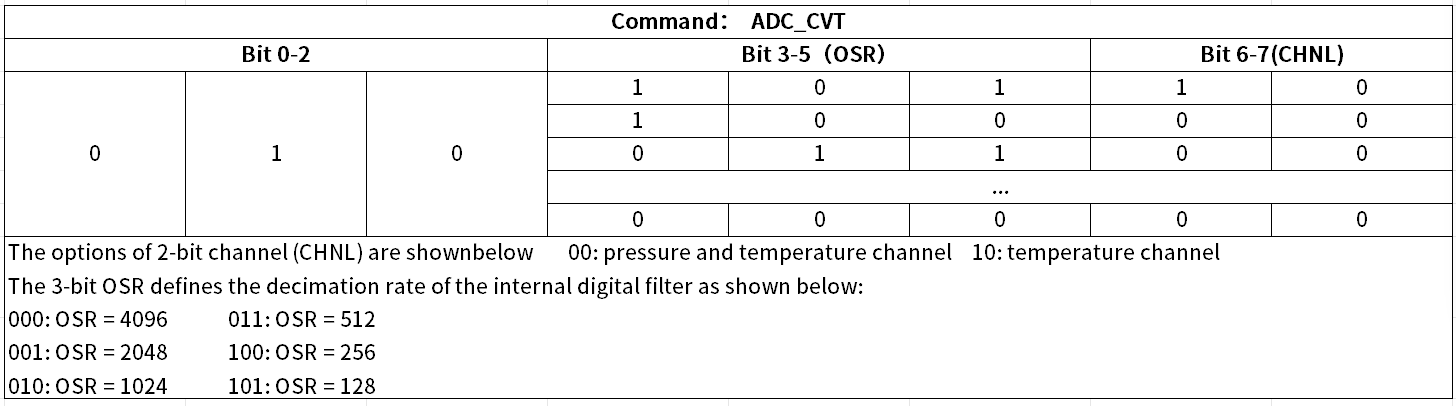 例如,通过向寄存器写入ADC_CVT指令(010, 3-bit OSR, 2-bit CHNL),即可设置传感器输出的数字信号类型(温度或温度与气压)及其内部的OSR过采样率。