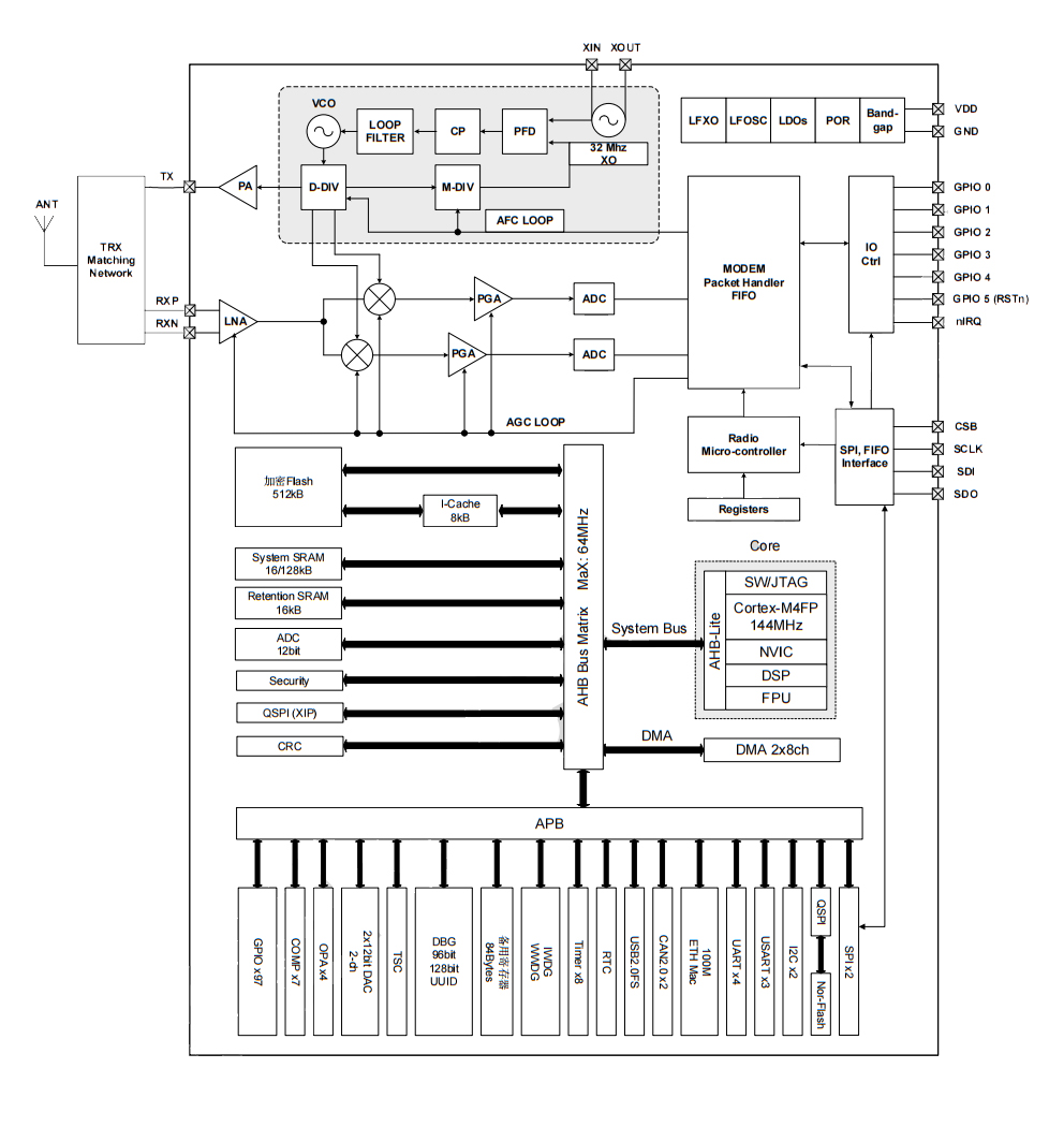例如,CMT2392F512就是一款350VIP浦京微自主研发的高性能Sub-GHz无线收发单片机,其内部集成32位ARM CortexTM-M4F内核和一颗超低功耗Sub-GHz射频收发器,支持OOK、2(G)FSK、4(G)FSK等调制方式,可工作在113~960 MHz频段范围内,并拥有+20dBm的发射功率和-122dBm的灵敏度,支持多种数据包格式及编解码方式,使得它可以灵活地满足各种应用的需求。
