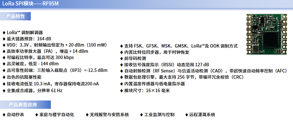 例如,350VIP浦京微自主研发的RFM95就是一款采用先进数模混合设计,基于独创自适应速率算法,支持多频段、多调制方式(LoRa、(G)FSK、(G)MSK、OOK)的LoRa SPI模块;它不仅能有效提升物联网设备的无线通信链路性能,还能覆盖从远距离、低速率到中短距离、中高速率的通信场景,且电流功耗显著低于行业内其他装置。