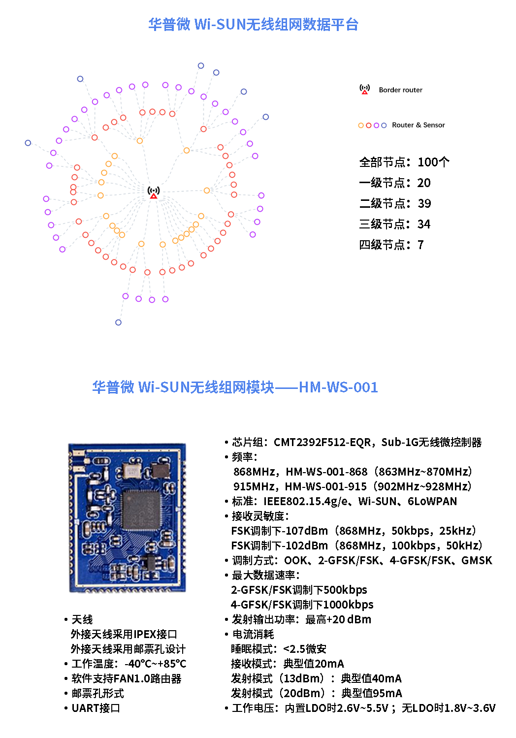 例如,HM-WS-001就是一款完全符合Wi-SUN FAN1.0规范和功能要求的模块产品,其射频通信频段为868MHz与915MHz;最大发射功率20dBm,最大接收灵敏度-107 dBm(868MHz,50kbps、25KHz);具有长距离通信,超低功耗,收发一体等优势。