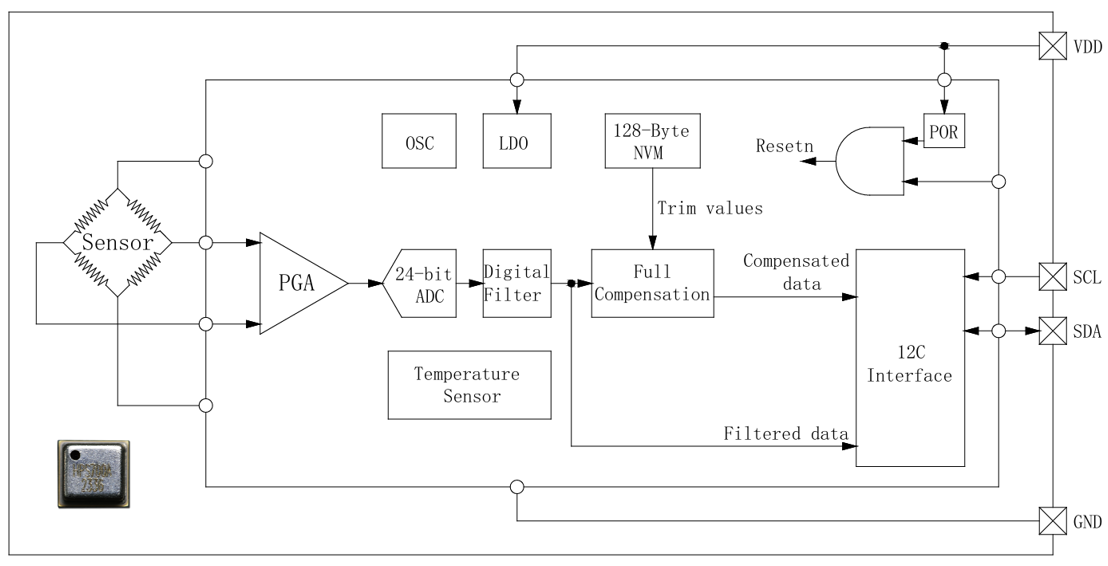 HPS700A的压力测量精度可达±2kPa,支持-40℃~85℃宽温工作,量程为0~1600kPa。HPS700A出厂前已进行数据标定和温度补偿,可以节省外部MCU的工作量。HPS700A芯片采用8-PIN LGA贴片封装,并且符合 RoHS 标准。